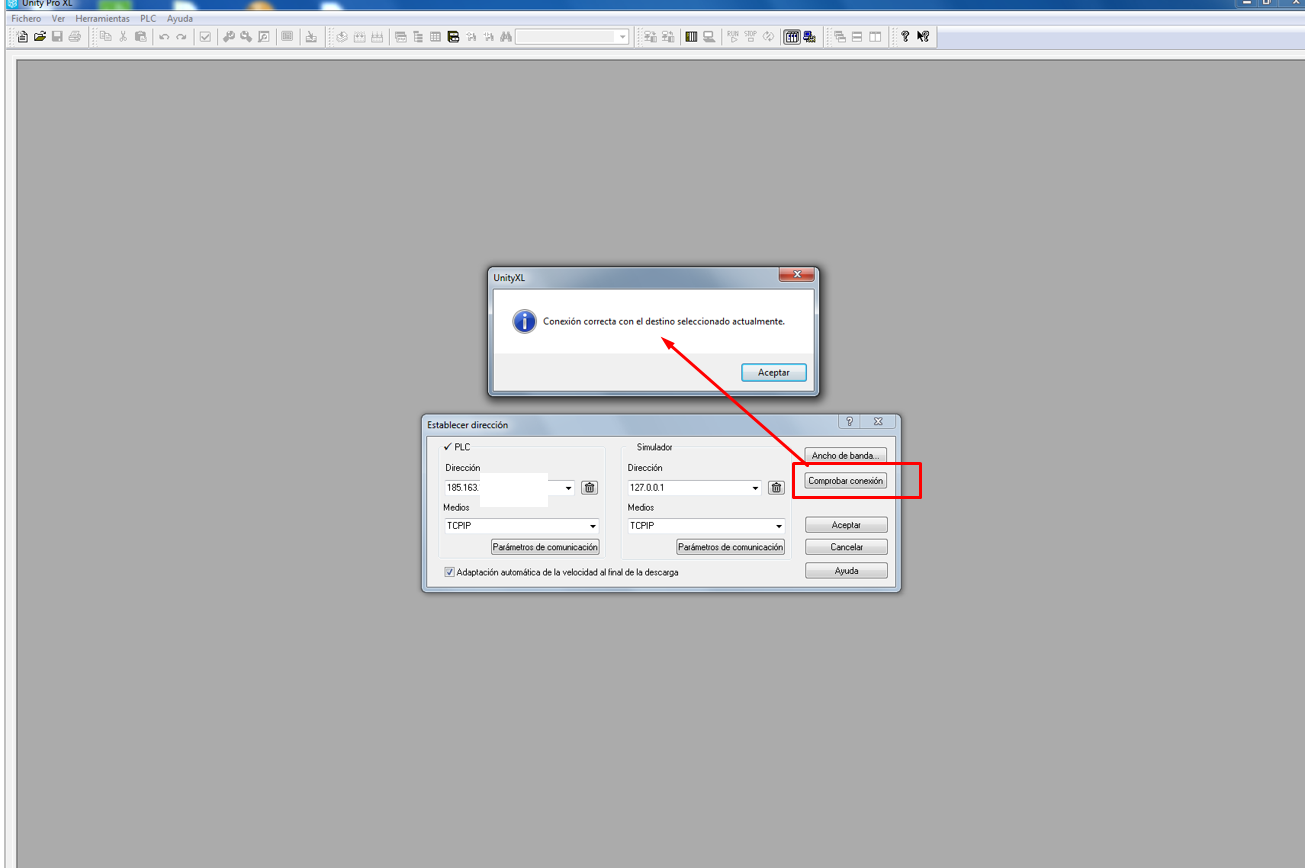 Posteriormente, mediante la herramienta de programación Unity Pro, se estableció conexión con el PLC y se comprobó que el acceso remoto era posible.