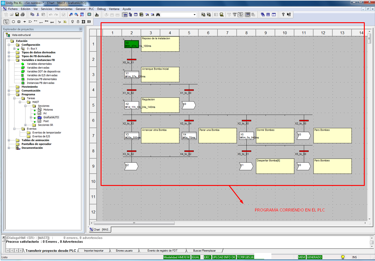 Además, desde el propio entorno se pudo transferir el proyecto alojado en el controlador y visualizar la lógica de control en ejecución: